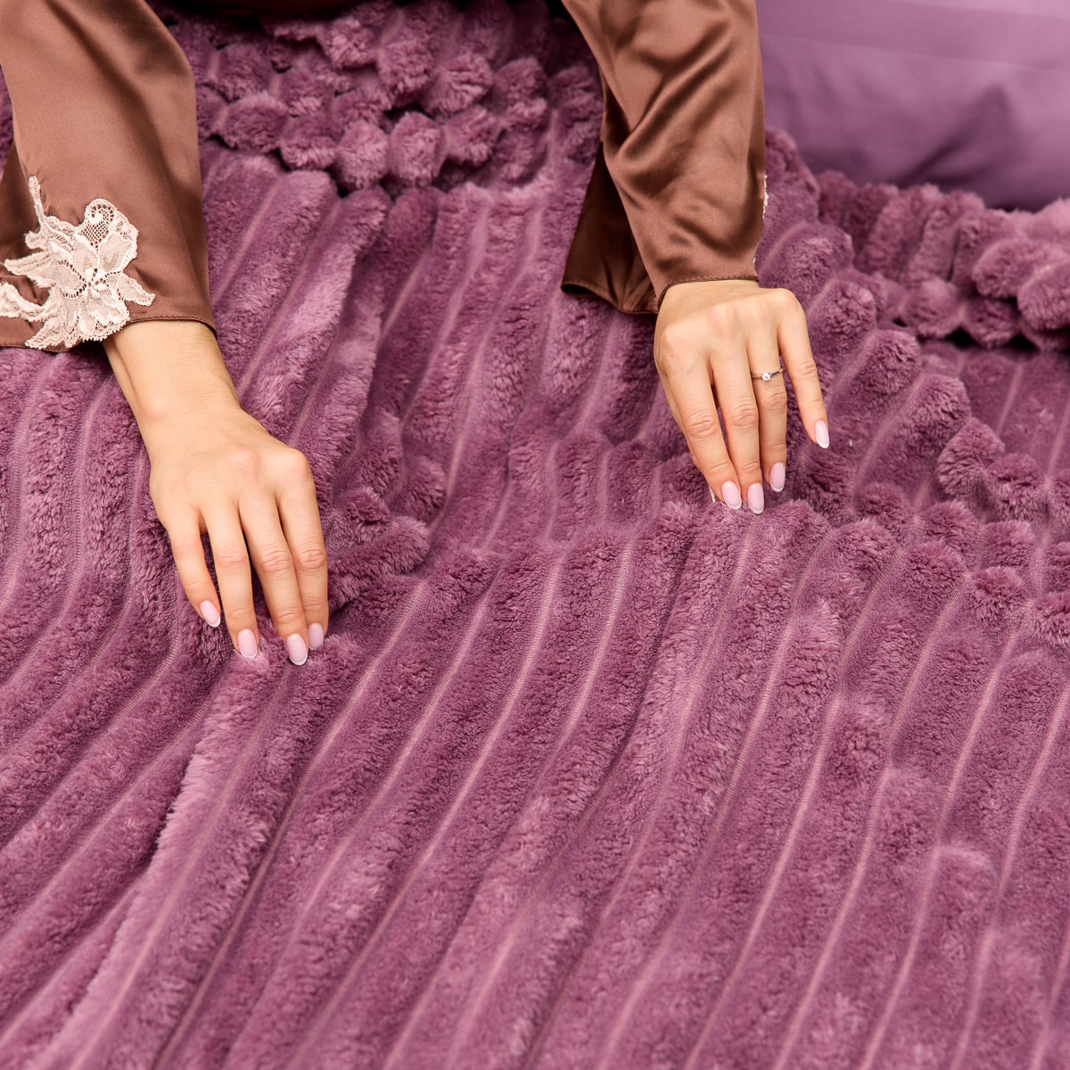 В комплект входит простыня, две наволочки (50×70 или 70×70 см), а также роскошный бархатный плед, который придаёт ещё больше тепла и изысканности. Плед можно использовать как декоративный элемент или как мягкое покрывало для прохладных вечеров.