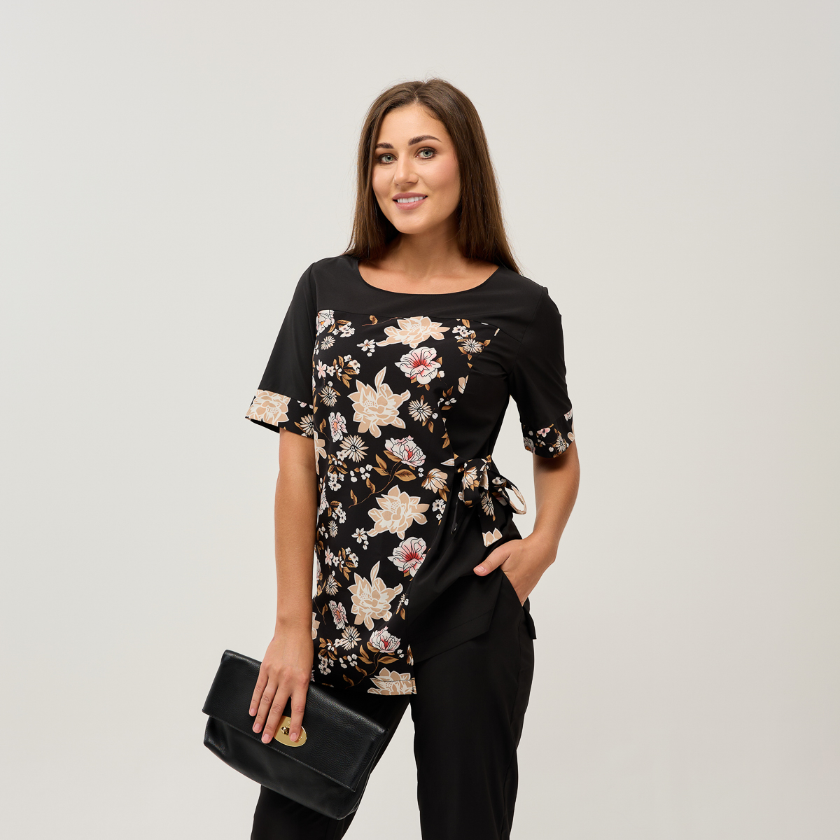 Ребекка - костюм, который мгновенно добавит изящества вашему образу! Сшит из невероятно мягкой и легкой ткани. Уникальный крой блузы подойдет для любого типа фигуры и подчеркнет ее женскую привлекательность. Цветочный рисунок добавит свежести, а укороченные, слегка облегающие брюки с карманами акцентируют внимание на изяществе ваших ног.