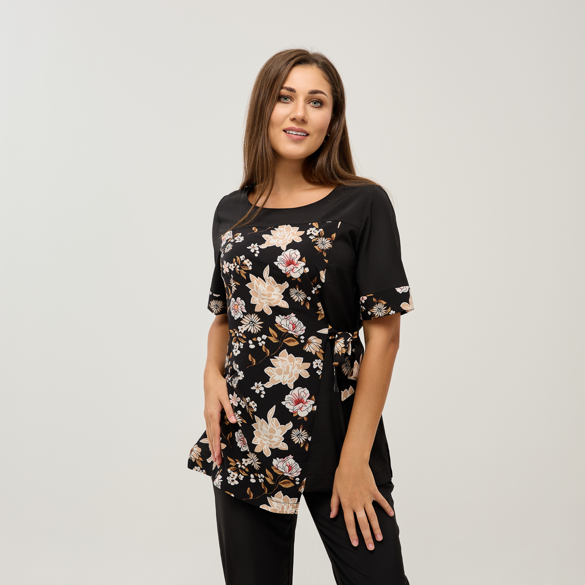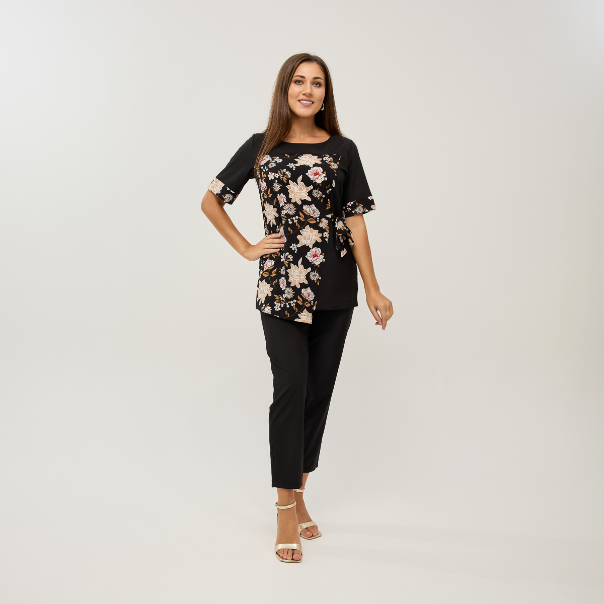 Ребекка - костюм, который мгновенно добавит изящества вашему образу! Сшит из невероятно мягкой и легкой ткани. Уникальный крой блузы подойдет для любого типа фигуры и подчеркнет ее женскую привлекательность. Цветочный рисунок добавит свежести, а укороченные, слегка облегающие брюки с карманами акцентируют внимание на изяществе ваших ног.