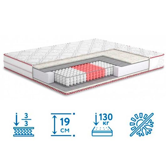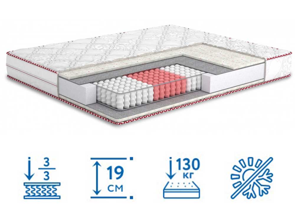 Матрас Four Red Sangria/Сангрия купить в интернет-магазине Матрас ТВ можно на очень привлекательных условиях. Модель со средним уровнем жесткости удовлетворит потребность большинства покупателей. Конструкция основана на блоке несвязанных пружин, дополнена современными наполнителями. Функция "Зима-лето" позволяет обеспечить здоровый сон независимо от сезона, просто перевернув приспособление. Изделие высотой 19 см способно выдержать человека весом до 130 кг, сохранив при этом целостность и потребительские свойства.