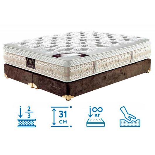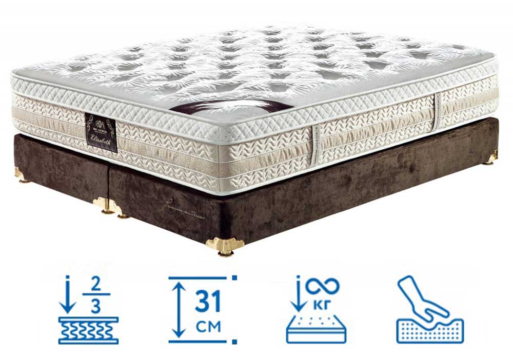 Матрас King Mattresses Elizabeth/Элизабет купить в интернет-магазине Матрас ТВ заинтересованы ценители роскошных и качественных спальных принадлежностей. Конструктивными особенностями модели высотой 31 см является сбалансированное сочетание наполнителей и уникальная система поддержки. Инженеры МатроЛюкс сумели создать красивый и практичный матрас с потрясающими потребительскими свойствами. Приспособление имеет две функциональных стороны разного уровня жесткости, способно выдержать любой вес.