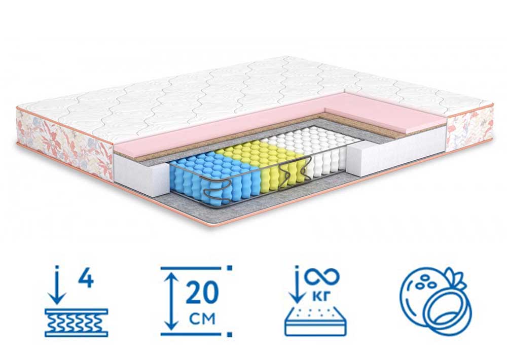 Односторонний матрас Rose купить в интернет-магазине Матрас ТВ можно, не покидая свой дом. Изделие 20 см высотой обладает универсальной средней степенью жесткости, сможет выдержать любой вес человека. Основу конструкции составляет система несвязанных пружин Pocket Spring, дополненная рамой по внешнему периметру. Приспособление обеспечит комфортные условия для полноценного ночного сна.