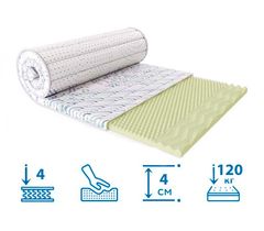 Характеристики Ширина, см 70,80,90,120,140,150,160 Длина, см 190,200 Висота, см 4 Тип матраса - с ортопедическими свойствами,  Наполнитель Высокоплотная пена с ортопедическими свойствами Повышенный уровень комфорта  Наполнитель – 100% пенополиуретан Чехол – стеганный жаккард (100% хлопок) с одной стороны, Спанбонд (флизелин)  с другой чехла Не съемный Жесткость средняя Нагрузка 120 кг