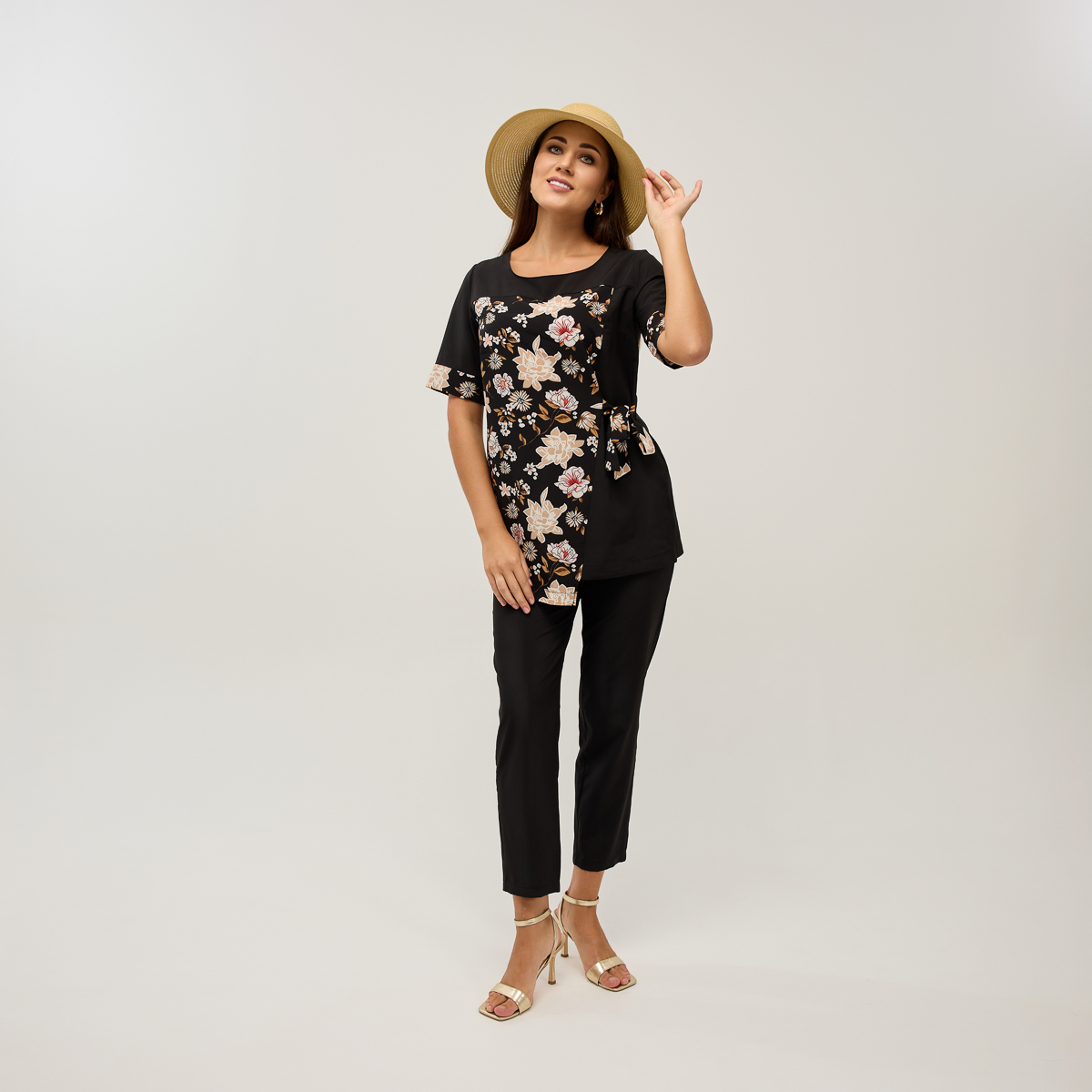 Ребекка - костюм, який миттєво додасть вишуканості вашому образу! Пошитий з неймовірно м'якої та легкої тканини. Унікальний крій блузки підійде для будь-якого типу фігури та підкреслить її жіночу привабливість. Квітковий малюнок додасть свіжості, а скорочені, легко облягаючі брюки з кишенями акцентують увагу на вишуканості ваших ніг.