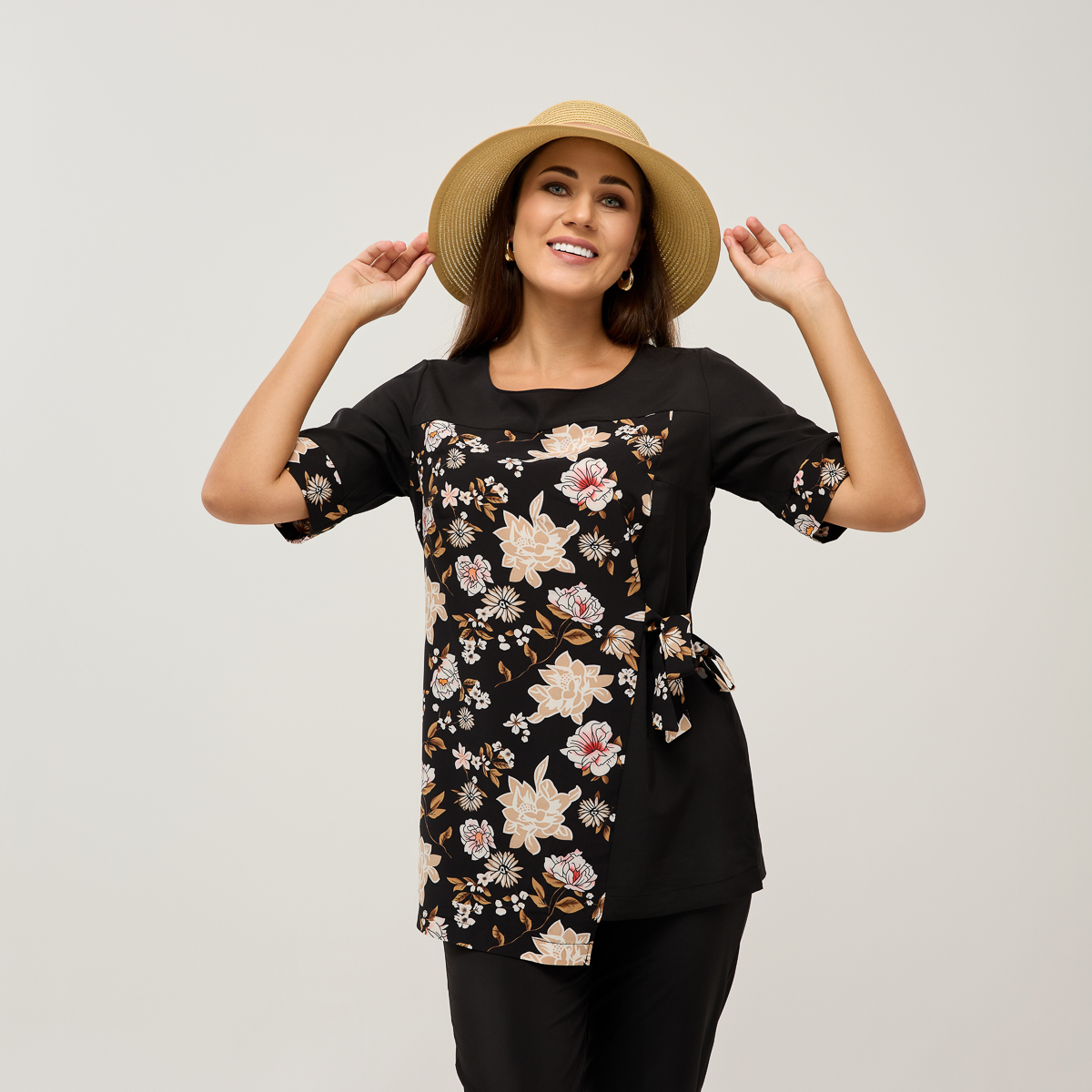 Ребекка - костюм, який миттєво додасть вишуканості вашому образу! Пошитий з неймовірно м'якої та легкої тканини. Унікальний крій блузки підійде для будь-якого типу фігури та підкреслить її жіночу привабливість. Квітковий малюнок додасть свіжості, а скорочені, легко облягаючі брюки з кишенями акцентують увагу на вишуканості ваших ніг.