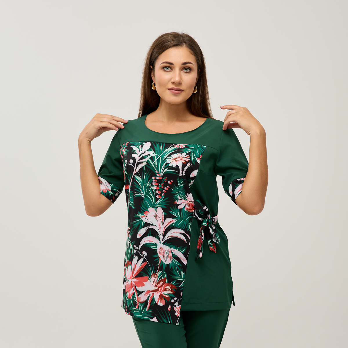 Ребекка - костюм, який миттєво додасть вишуканості вашому образу! Пошитий з неймовірно м'якої та легкої тканини. Унікальний крій блузки підійде для будь-якого типу фігури та підкреслить її жіночу привабливість. Квітковий малюнок додасть свіжості, а скорочені, легко облягаючі брюки з кишенями акцентують увагу на вишуканості ваших ніг.