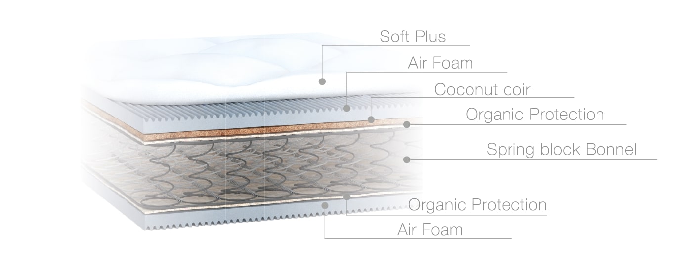• Organic Protection. Захисний прошарок з натуральної сировини грає роль ізоляції між м'якими наповнювачами та сталевими пружинами.