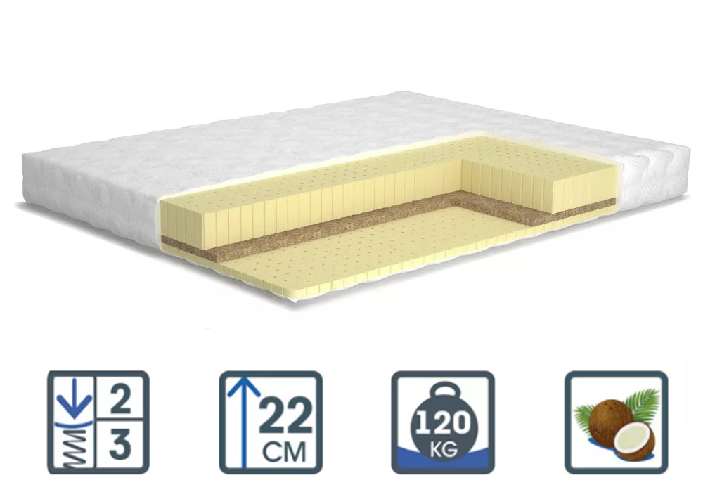 - Кокосова койра. Щільна прошарок з жорсткого кокосового волокна надає стійкість до деформації, певну жорсткість і міцність. Компонент не висихає, не схильний до гниття та деформації.