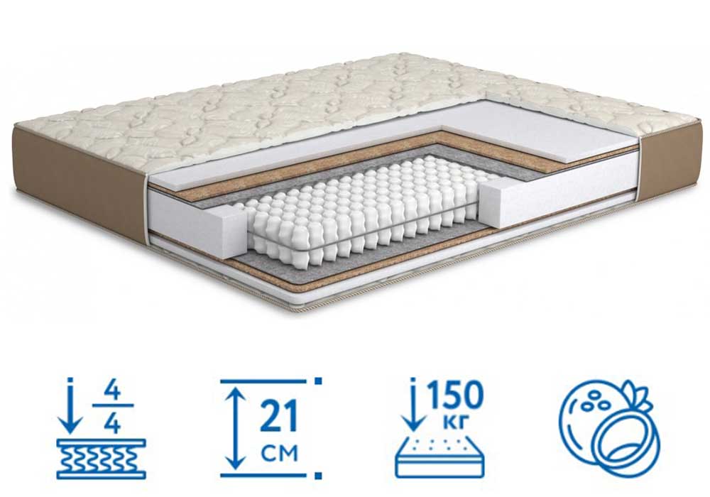 - Кокосова койра. Для виробництва щільної плити застосовується кокосове волокно та натуральний латекс. Жорсткий прошарок володіє відмінними ортопедичними властивостями та тривалим терміном служби.