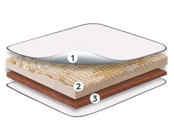 Настил з кокосової койри підвищує жорсткість поверхні, продовжує термін експлуатації приналежності. Рослинне волокно не здатне викликати алергічну реакцію. Воно не розсихається, не боїться надмірного механічного навантаження, не гниє.